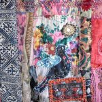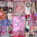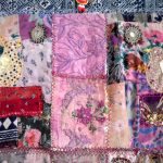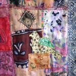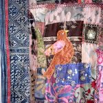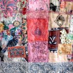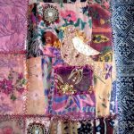 This quilt was made from an old patchwork hippy dress I had stored away. I had found it in a charity shop many years ago, it was great for this latest project. Well, the dress became the inspiration for the quilt! The vintage materials went well with the old Indian embroidery pieces. The border is also made from an old hippy shoulder bag. On each panel I sewed on a bird, decorating each panel with some mirror-work and the birds each needed a perch, which was supplied using more of the Indian embroidery squares. I enjoyed the vintage shabby chic look of the finished piece along with the muted tones of the faded colours.