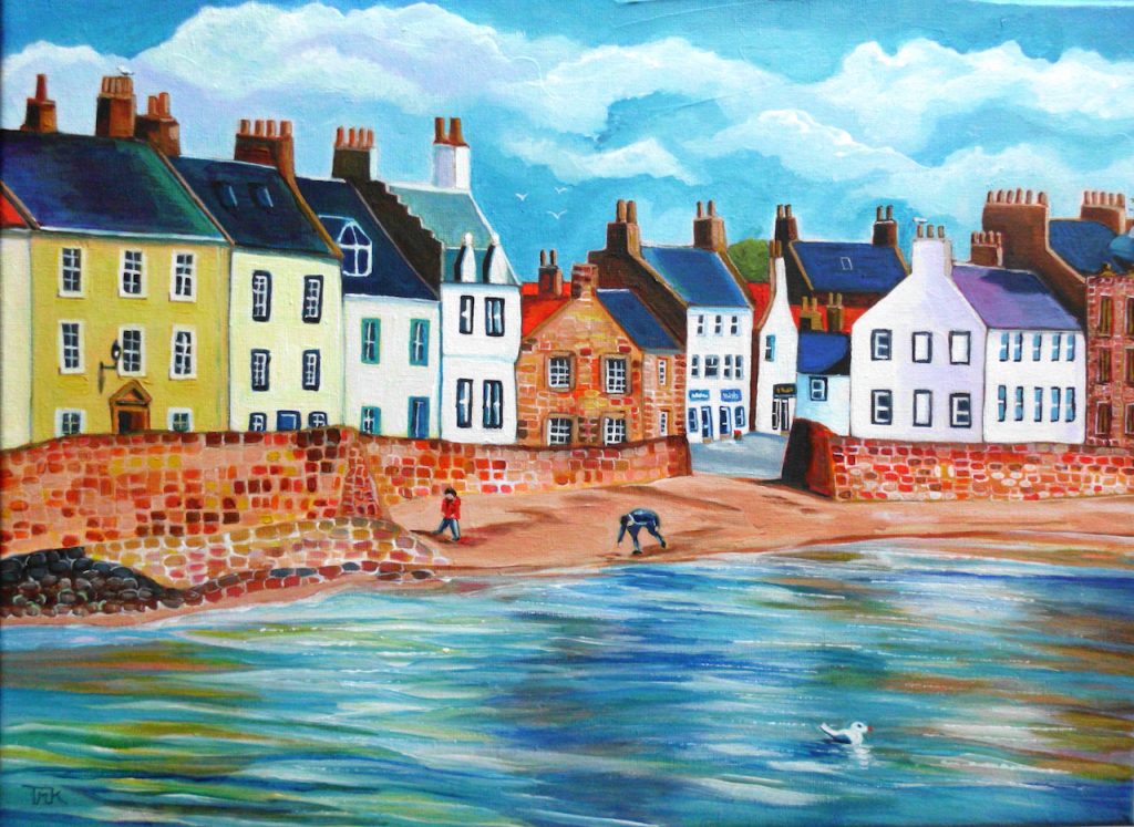Quirky, colourist painting in acrylics. Along the coast of East Neuk, seaglass washes up on the shore, mixed amongst the colourful shells. Most people enjoy taking a little ‘found’ treasure home with them.